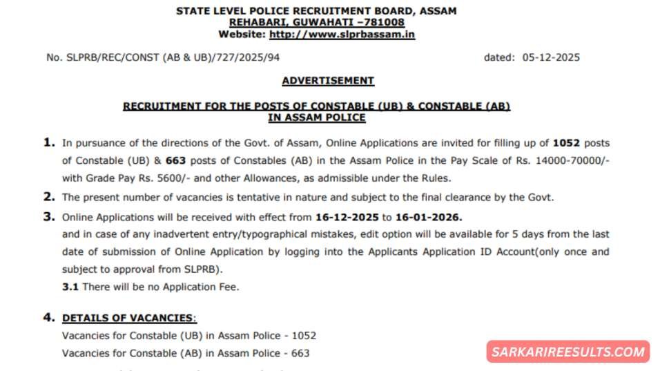 अगर आप सरकारी नौकरी की तैयारी कर रहे हैं, तो Assam Police Constable Recruitment 2025 आपके लिए एक Golden Opportunity है। SLPRB Assam ने Constable (UB/AB) के कुल 1715 पदों पर नए नोटिफिकेशन जारी किए हैं। बिना किसी आवेदन शुल्क, बेहतरीन सैलरी व आसान चयन प्रक्रिया इस भर्ती को और भी खास बनाती है। पूरी जानकारी यहाँ sarkarireesults.com पर विस्तार से दी जा रही है।