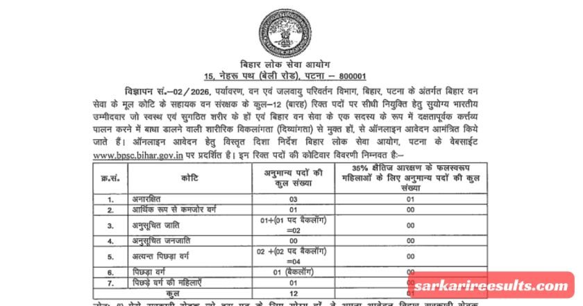 बिहार लोक सेवा आयोग (BPSC) ने हाल ही में असिस्टेंट कंजर्वेटर ऑफ फॉरेस्ट (ACF) के पदों के लिए एक नई भर्ती अधिसूचना जारी की है। यह Bihar BPSC ACF Recruitment 2026 उन उम्मीदवारों के लिए एक सुनहरा अवसर है जो पर्यावरण संरक्षण और वन प्रबंधन के क्षेत्र में अपना करियर बनाना चाहते हैं। कुल 12 पदों पर भर्ती होने वाली है, और आवेदन प्रक्रिया 12 जनवरी 2026 से शुरू हो चुकी है। अगर आप प्रकृति प्रेमी हैं और सरकारी नौकरी की तलाश में हैं, तो यह योजना आपके लिए क्यों बेहतर है? क्योंकि ACF का पद न केवल अच्छी सैलरी और भत्ते प्रदान करता है, बल्कि आपको वनों की रक्षा, वन्यजीव संरक्षण और सतत विकास में योगदान देने का मौका देता है। आज के समय में जब जलवायु परिवर्तन एक बड़ी चुनौती है, ACF जैसा पद आपको समाज और पर्यावरण के लिए कुछ सार्थक करने का प्लेटफॉर्म देता है। sarkarireesults.com पर हम आपको इस भर्ती की हर डिटेल्स से अपडेट रखते हैं, ताकि आप आसानी से आवेदन कर सकें।