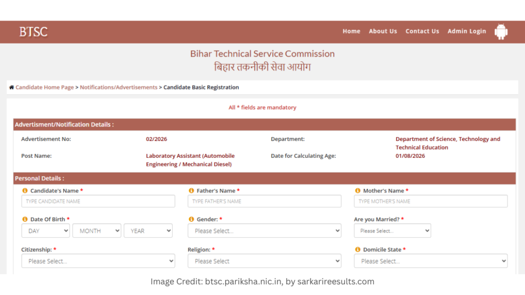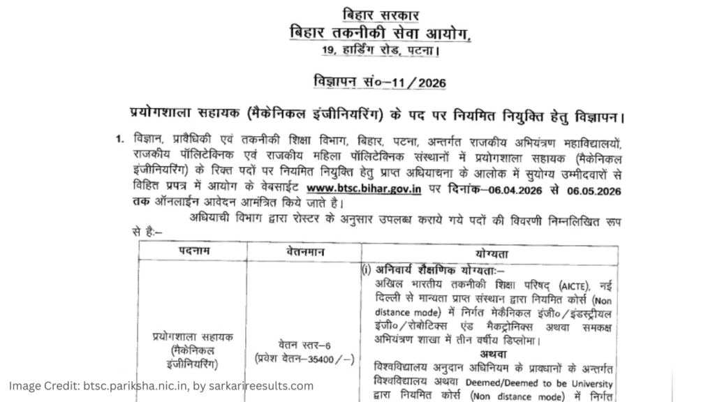 BTSC Recruitment 2026, अगर आप बिहार में सरकारी नौकरी की तैयारी कर रहे हैं, तो आपके लिए बड़ी खुशखबरी है। Bihar Technical Service Commission (BTSC) ने Laboratory Assistant Recruitment 2026 का नोटिफिकेशन जारी कर दिया है। इस भर्ती के तहत कुल 1090 पदों पर नियुक्ति की जाएगी। इच्छुक उम्मीदवार 06 अप्रैल 2026 से 06 मई 2026 तक ऑनलाइन आवेदन कर सकते हैं। यह भर्ती खासतौर पर उन उम्मीदवारों के लिए है जिनके पास Diploma या B.E./B.Tech की डिग्री संबंधित ट्रेड में है।