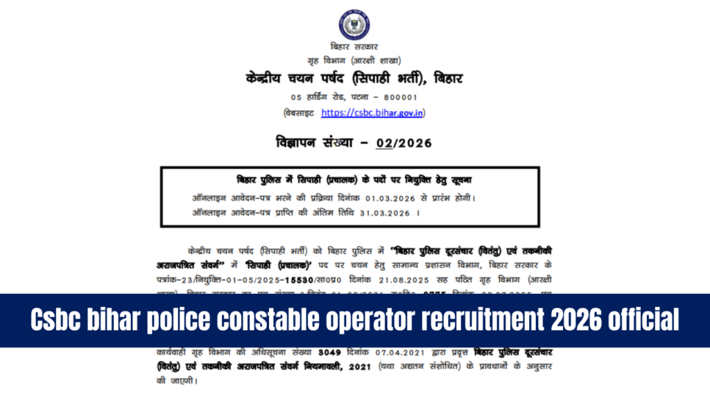 CSBC Constable Recruitment 2026: बिहार पुलिस में नौकरी की तैयारी कर रहे युवाओं के लिए बड़ी खुशखबरी है। Central Selection Board of Constable (CSBC) ने Bihar Police Radio Organization में Constable (Operator) के 993 पदों पर भर्ती का आधिकारिक नोटिफिकेशन जारी कर दिया है। CSBC Bihar Police Constable (Op… इस भर्ती के लिए ऑनलाइन आवेदन प्रक्रिया 01 मार्च 2026 से शुरू होकर 31 मार्च 2026 तक चलेगी। इच्छुक उम्मीदवार आधिकारिक वेबसाइट के माध्यम से आवेदन कर सकते हैं। sarkaireesults.com पर भी आपको इस भर्ती से जुड़ी सभी अपडेट और डायरेक्ट लिंक मिलेंगे।