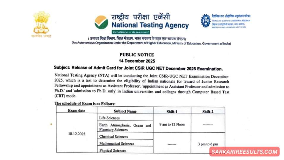 CSIR NET Admit Card 2025 अगर आप साइंस स्ट्रीम में रिसर्च या लेक्चरशिप की तैयारी कर रहे हैं, तो ये खबर आपके लिए बड़ी राहत वाली है। नेशनल टेस्टिंग एजेंसी (NTA) ने CSIR UGC NET December 2025 का एडमिट कार्ड आखिरकार जारी कर दिया है। 14 दिसंबर 2025 को रिलीज हुए इस हॉल टिकट को आप आधिकारिक वेबसाइट से आसानी से डाउनलोड कर सकते हैं। परीक्षा सिर्फ 18 दिसंबर 2025 को होने वाली है, तो देर न करें और अपना एडमिट कार्ड अभी चेक कर लें। sarkarireesults.com पर हम आपको हर सरकारी नौकरी और परीक्षा की लेटेस्ट जानकारी सबसे पहले देते हैं!