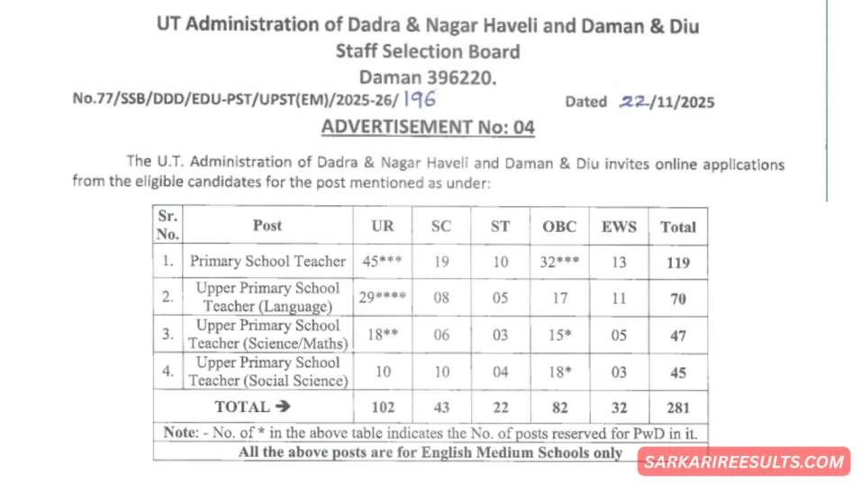 DDD Upper Primary Teacher Recruitment 2025: (281 पदों पर भर्ती सुनहरा मौका) – तुरंत अप्लाई करें! ये सिर्फ नौकरी नहीं, बल्कि दादरा-नगर हवेली और दमन-दिऊ जैसे खूबसूरत इलाकों में बच्चों के भविष्य को आकार देने का मौका है। यहां की स्कूलिंग सिस्टम तेजी से डेवलप हो रही है, और इंग्लिश मीडियम टीचर्स की डिमांड बढ़ रही है। कुल 281 पोस्ट्स में से 119 प्राइमरी और 162 अपर प्राइमरी के हैं। अगर आप ग्रेजुएट हैं और B.Ed या D.El.Ed होल्डर, तो ये आपकी किस्मत खोल सकता है।
