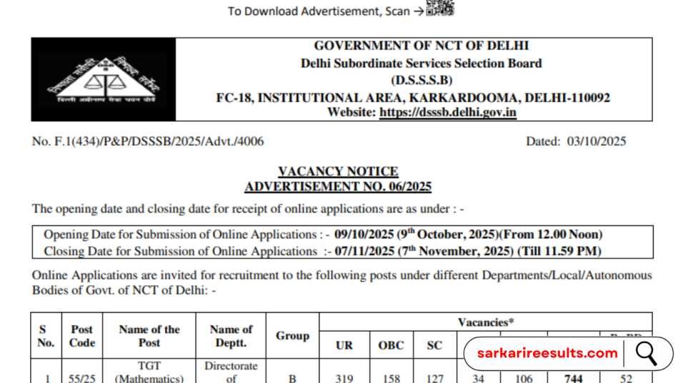 दोस्तों, अगर आप शिक्षण के क्षेत्र में करियर बनाने का सपना देख रहे हैं, तो DSSSB TGT Teacher Recruitment 2025 आपके लिए एक शानदार मौका लेकर आया है! दिल्ली सबॉर्डिनेट सर्विसेज सिलेक्शन बोर्ड (DSSSB) ने 5346 TGT पदों के लिए नोटिफिकेशन (एडवर्टाइजमेंट नंबर 06/2025) जारी किया है। यह भर्ती दिल्ली के सरकारी स्कूलों में शिक्षकों की कमी को पूरा करने के लिए है, जहां आपको जॉब सिक्योरिटी, आकर्षक वेतन, और कैरियर ग्रोथ के ढेरों अवसर मिलेंगे। अगर आप ग्रेजुएट हैं और CTET पास कर चुके हैं, तो यह मौका आपके लिए है। आइए, sarkarireesults.com पर इस भर्ती की पूरी जानकारी विस्तार से जानते हैं।