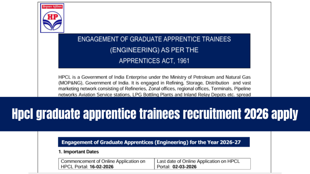 HPCL Graduate Apprentice Trainees Recruitment 2026: अगर आपने Engineering पूरी कर ली है और Government Company में career शुरू करना चाहते हैं, तो आपके लिए शानदार मौका आया है. Hindustan Petroleum Corporation Limited (HPCL) ने Graduate Apprentice Trainee (Engineering) भर्ती 2026-27 के लिए आधिकारिक नोटिफिकेशन जारी कर दिया है. यह भर्ती Ministry of Petroleum and Natural Gas के अंतर्गत एक प्रतिष्ठित Government PSU में Apprenticeship करने का मौका देती है. इस भर्ती के तहत Civil, Mechanical, Electrical और Instrumentation Engineering graduates को पूरे भारत में Apprentice Training दी जाएगी. sarkaireesults.com पर दी गई जानकारी के अनुसार चयनित उम्मीदवारों को ₹25,000 प्रति माह stipend मिलेगा.