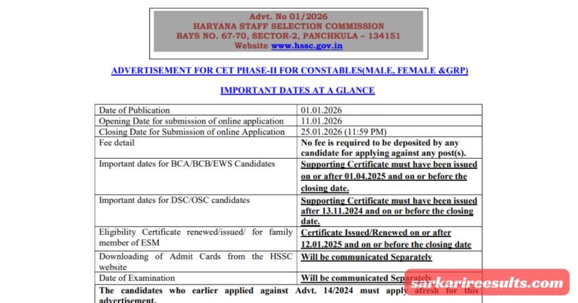 HSSC ने 1 जनवरी 2026 को नोटिफिकेशन जारी किया और अप्लाई की प्रक्रिया 11 जनवरी से शुरू हो चुकी है। आखिरी तारीख 25 जनवरी 2026 है, इसलिए देर न करें। यह भर्ती हरियाणा पुलिस डिपार्टमेंट के तहत है, जहां जनरल ड्यूटी कांस्टेबल (मेल और फीमेल) के पद भरे जाएंगे। sarkarireesults.com पर आप ऐसी सभी सरकारी भर्तियों की अपडेट्स पा सकते हैं, जो आपके सपनों को हकीकत में बदल सकती हैं।