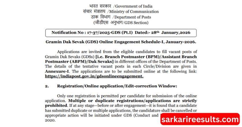 डाक विभाग (Department of Post, India Post) ने Gramin Dak Sevak (GDS) India Post GDS Bharti 2026 का नोटिफिकेशन जारी कर दिया है। इस भर्ती के तहत 28,636 पदों पर सीधी भर्ती की जाएगी। सबसे खास बात यह है कि इसमें कोई लिखित परीक्षा नहीं होगी, चयन पूरी तरह मेरिट लिस्ट के आधार पर होगा। जो उम्मीदवार 10वीं पास हैं और सरकारी नौकरी की तलाश में हैं, उनके लिए यह भर्ती Golden Opportunity है। ऐसी भर्तियों की जानकारी सबसे पहले अक्सर sarkaireesults.com जैसी वेबसाइट्स पर भी मिल जाती है।