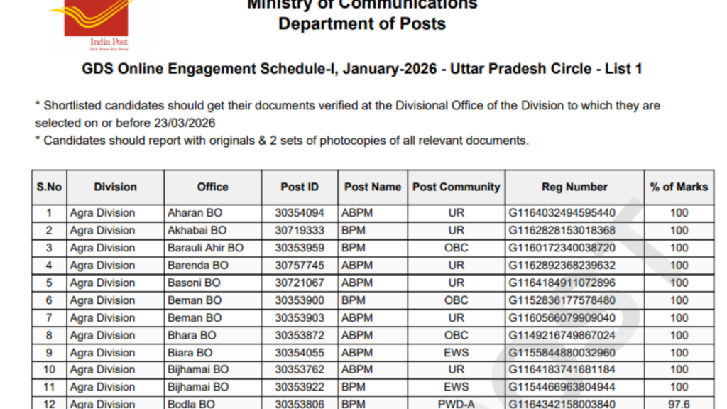 मीडिया रिपोर्ट्स के अनुसार, पहली सूची में चयनित उम्मीदवारों का Document Verification अभी चल रहा है। इसके बाद बची हुई रिक्तियों के आधार पर दूसरी मेरिट लिस्ट जारी की जाएगी। उम्मीदवार आधिकारिक वेबसाइट India Post पर जाकर अपना नाम चेक कर सकते हैं।
