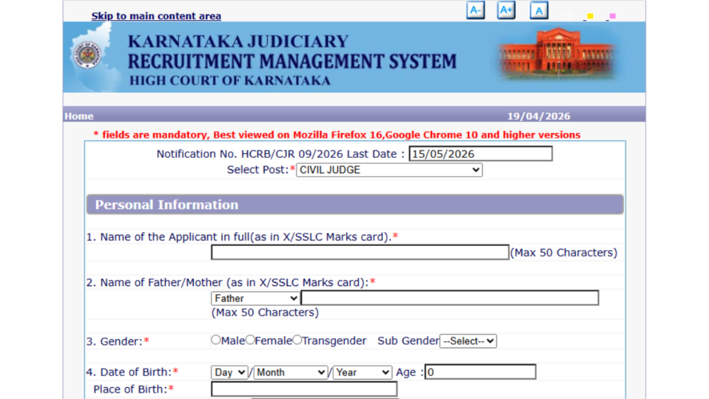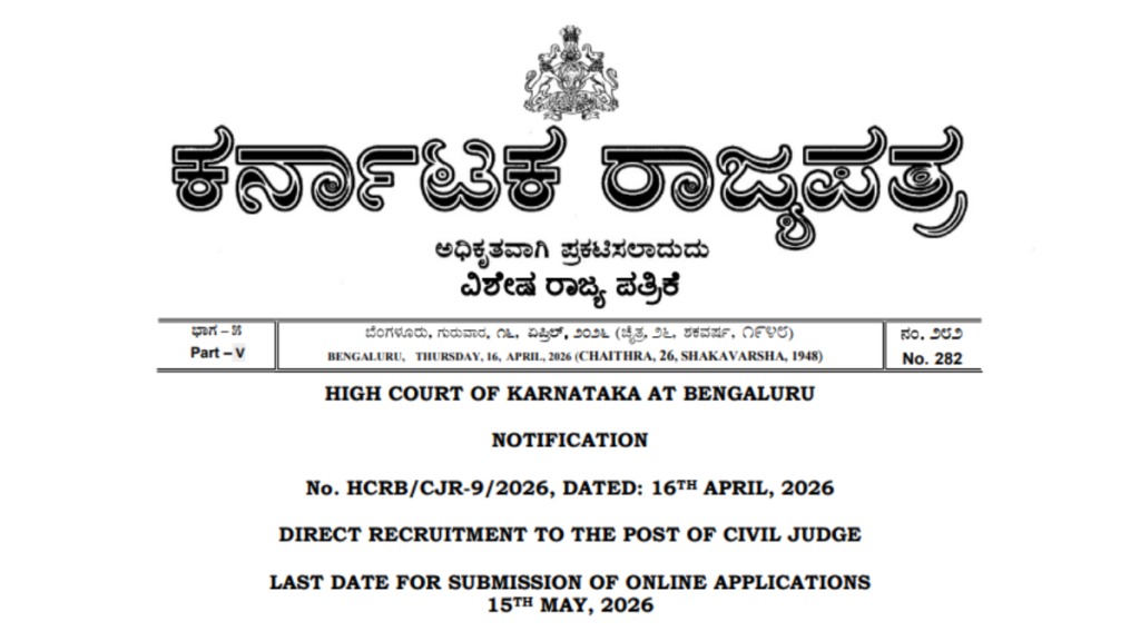 Karnataka High Court Recruitment 2026, अगर आप लॉ ग्रेजुएट हैं और जज बनने का सपना देख रहे हैं, तो आपके लिए शानदार मौका आया है। High Court of Karnataka ने Civil Judge के 90 पदों पर भर्ती के लिए आधिकारिक नोटिफिकेशन जारी कर दिया है। इच्छुक उम्मीदवार 15 मई 2026 तक ऑनलाइन आवेदन कर सकते हैं। इस भर्ती से जुड़ी पूरी जानकारी जैसे योग्यता, चयन प्रक्रिया, आवेदन प्रक्रिया आदि नीचे आसान भाषा में दी गई है। अधिक जानकारी के लिए आप वेबसाइट sarkaireesults.com पर भी विजिट कर सकते हैं।
