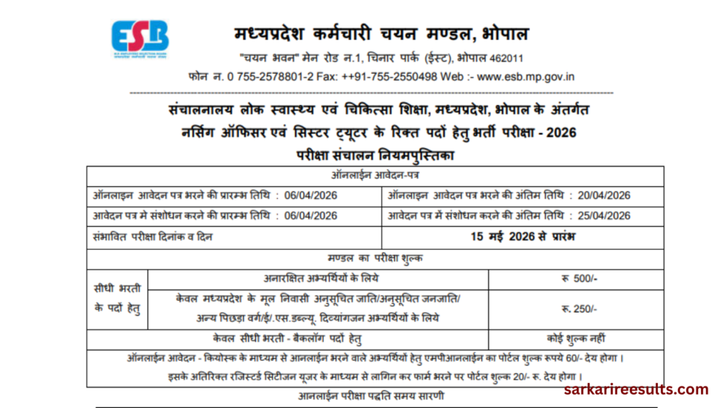 MP Nursing Officer Vacancy 2026, मध्य प्रदेश कर्मचारी चयन मंडल (MPESB) द्वारा Nursing Officer और Sister Tutor भर्ती परीक्षा 2026 के लिए आधिकारिक नोटिफिकेशन जारी कर दिया गया है। यह भर्ती लोक स्वास्थ्य एवं चिकित्सा शिक्षा विभाग के अंतर्गत आयोजित की जा रही है। अगर आप नर्सिंग फील्ड में सरकारी नौकरी की तैयारी कर रहे हैं, तो यह आपके लिए एक शानदार अवसर है।