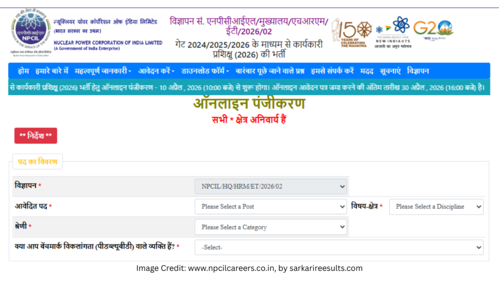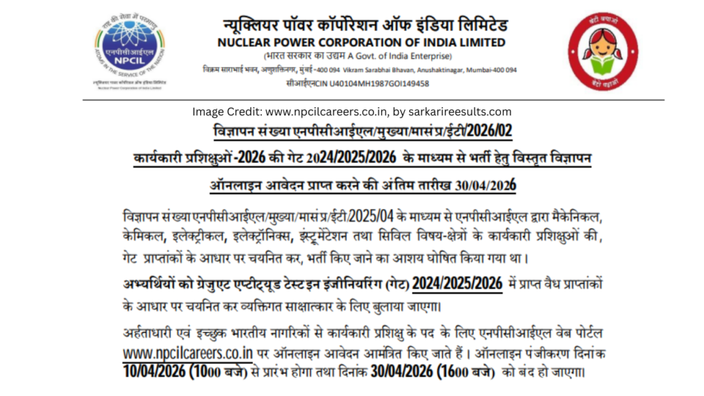 NPCIL Online Form 2026: अगर आप इंजीनियरिंग बैकग्राउंड से हैं और सरकारी नौकरी की तलाश में हैं, तो आपके लिए NPCIL (Nuclear Power Corporation of India Limited) की यह भर्ती शानदार मौका है। इस भर्ती के तहत Executive Trainee (ET) 2026 पदों पर चयन किया जाएगा, जो GATE 2024/2025/2026 स्कोर के आधार पर होगा। यह जानकारी आप sarkaireesults.com जैसी वेबसाइट्स पर भी आसानी से देख सकते हैं।