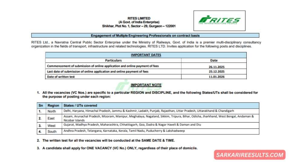 RITES रेल मंत्रालय का प्रमुख कंसल्टेंसी आर्म है, जो इंफ्रास्ट्रक्चर प्रोजेक्ट्स पर काम करता है। ये भर्ती 2025 में रेलवे के एक्सपैंशन प्लान्स का हिस्सा है, जहां 400 असिस्टेंट मैनेजर पोस्ट्स पर वैकेंसी हैं। सिविल इंजीनियरिंग से 150, इलेक्ट्रिकल से 80, और आईटी/फार्मा जैसे फील्ड्स में 50-50 पद। अगर आप ग्रेजुएट हैं, तो ये जॉब आपको 23,000+ सैलरी के साथ PSU लाइफ देगी। हाल ही में RITES ने मेट्रो और हाई-स्पीड रेल प्रोजेक्ट्स में रिकॉर्ड निवेश किया है, तो यहां करियर ग्रोथ की कोई कमी नहीं। sarkarireesults.com पर चेक करें – ऐसे अपडेट्स रोज आते हैं!