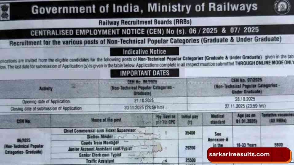 सरकारी नौकरी, और वो भी रेलवे में! यह सपना कौन नहीं देखता? अगर आप भी रेलवे में एक पक्की और प्रतिष्ठित नौकरी की तलाश में हैं, तो आपके लिए खुशखबरी है। रेलवे रिक्रूटमेंट बोर्ड (RRB) ने नॉन-टेक्निकल पॉपुलर कैटेगरी (RRB NTPC Recruitment 2025) ग्रेजुएट लेवल के लिए 5800 पदों पर बंपर भर्ती का शॉर्ट नोटिस जारी कर दिया है। इसे कहते हैं, “सही समय पर सही मौका”!
