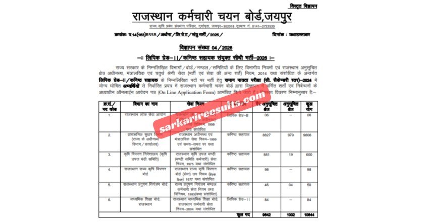 RSSB Clerk Recruitment 2026: राजस्थान में सरकारी नौकरी की तलाश कर रहे युवाओं के लिए एक शानदार मौका आया है! राजस्थान स्टाफ सिलेक्शन बोर्ड (RSSB) ने LDC (Lower Division Clerk) यानी क्लर्क ग्रेड-II और जूनियर असिस्टेंट के 10644 पदों के लिए भर्ती नोटिफिकेशन जारी किया है। अगर आप स्थिर सरकारी जॉब, अच्छी सैलरी और राजस्थान की संस्कृति से जुड़े रहने का सपना देखते हैं, तो ये भर्ती आपके लिए परफेक्ट है। sarkarireesults.com पर हम आपको इस भर्ती की हर डिटेल आसान भाषा में बता रहे हैं,