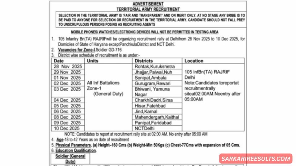 नमस्ते दोस्तों! अगर आपने कभी सोचा है कि देश की सेवा करते हुए अच्छी सैलरी और सम्मान भी कमाया जाए, तो ये मौका आपके लिए ही है! Territorial Army Recruitment 2025 के लिए 716 पदों पर भर्ती का नोटिफिकेशन जारी कर दिया है। सबसे खास बात – ये रैली 28 नवंबर 2025 से शुरू हो रही है और सिर्फ दिल्ली कैंट में होगी। Haryana + Delhi के सारे जिलों के कैंडिडेट्स के लिए एक ही जगह रैली!