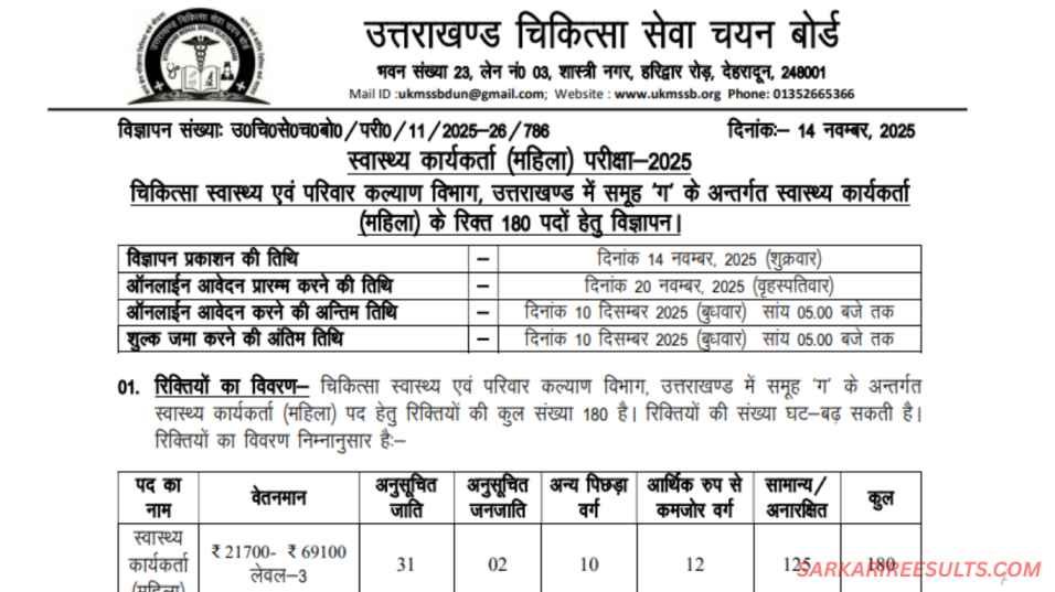 यदि आप उत्तराखंड में सरकारी नौकरी की तलाश कर रही हैं, तो ये खबर आपके लिए किसी खुशखबरी से कम नहीं है! UKMSSB Health Worker Vacancy 2025 ने 180 पदों पर भर्ती का ऐलान किया है, जो महिलाओं के लिए एक सुनहरा मौका है। कल्पना कीजिए – एक ऐसी नौकरी जहां आप न सिर्फ अपनी जिंदगी संवारेंगी, बल्कि हजारों परिवारों की सेहत को मजबूत करेंगी। उत्तराखंड मेडिकल सर्विस सिलेक्शन बोर्ड (UKMSSB) ने 14 नवंबर 2025 को नोटिफिकेशन जारी किया, और ऑनलाइन आवेदन 20 नवंबर से शुरू हो चुके हैं। अगर आप ANM ट्रेनिंग पूरी कर चुकी हैं, तो ये आपका ट्रांसफॉर्मेटिव करियर स्टार्ट हो सकता है।