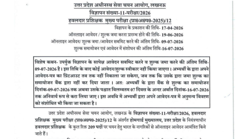 UPSSSC Havildar Instructor Recruitment 2026, अगर आप सरकारी नौकरी की तैयारी कर रहे हैं, तो आपके लिए एक शानदार मौका सामने आया है। उत्तर प्रदेश अधीनस्थ सेवा चयन आयोग (UPSSSC) ने Havildar Instructor Recruitment 2026 के तहत 209 पदों पर भर्ती का नोटिफिकेशन जारी कर दिया है। इस भर्ती के लिए ऑनलाइन आवेदन प्रक्रिया 19 जून 2026 से शुरू होगी और 09 जुलाई 2026 तक चलेगी।