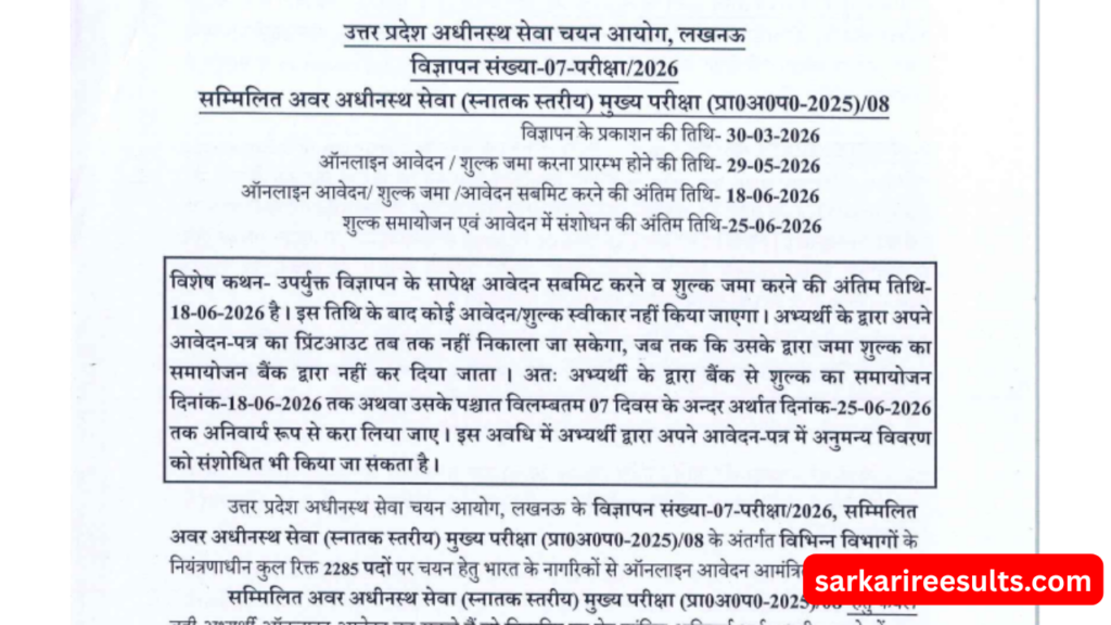 UPSSSC Lower PCS Recruitment 2026, उत्तर प्रदेश में सरकारी नौकरी की तैयारी कर रहे युवाओं के लिए बड़ी खबर सामने आई है। इस भर्ती के तहत कुल 2285 पदों पर नियुक्ति की जाएगी। इच्छुक उम्मीदवार 29 मई 2026 से 18 जून 2026 तक ऑनलाइन आवेदन कर सकते हैं। इस आर्टिकल में हम आपको इस भर्ती से जुड़ी सभी महत्वपूर्ण जानकारी जैसे – आवेदन तिथि, योग्यता, आयु सीमा, चयन प्रक्रिया और आवेदन कैसे करें – आसान भाषा में समझाएंगे।
